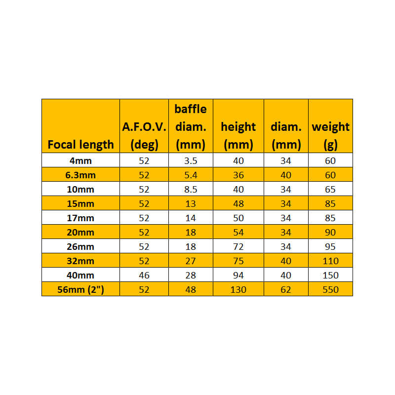 - 52-stupňové zorné pole (45° pri 40 milimetrovom okulári) – výrazne širšie ako Kellnerove a štandardné Plösslovy okuláre
