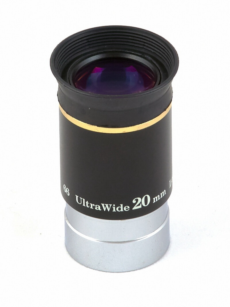 Okulár Sky-Watcher WA 20mm, 1,25″, 66°, širokouhlý okulár s 5 šošovkovou konštrukciou s viacnásobnými antireflexnými vrstvami, veľkou vzdialenosťou výstupnej pupily, s prehrnovacou očnicou. Kovové prevedenie so sklenenými šošovkami. Objímka má filtrový závit pre 1,25″ filtre.