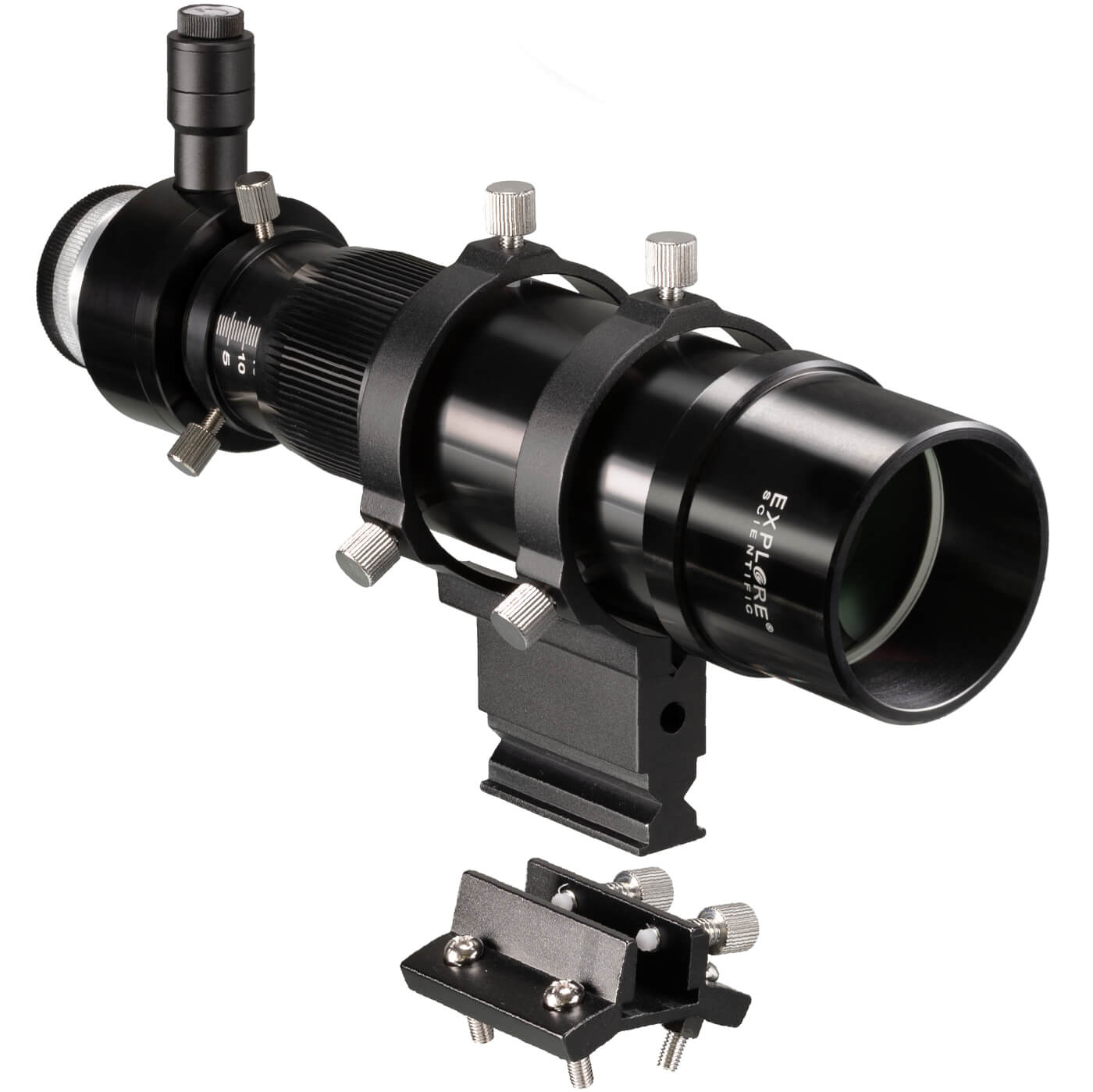 Celá montáž hľadáčika je vyrobená z hliníka a poskytuje stabilnú a odolnú základňu. Päticu hľadáčika je možné uchytiť na ďalekohľadovú rúru pomocou štyroch skrutiek M5, pričom rozteče otvorov sú 31,7 mm na pozdĺžnej aj priečnej osi. Šesť veľkých nastavovacích skrutiek s ryhovatým úchopom uľahčuje zarovnanie hľadáčika aj pri chladnom počasí. Všetky nastavovacie a upínacie skrutky majú plastové hroty, ktoré chránia povrch hľadáčika aj montáže pred poškriabaním. Pätice hľadáčika je kompatibilná s mnohými bežnými typmi ďalekohľadov, ako sú Explore Scientific, Bresser Messier a ďalšie. Ak existujúca pätice nie je kompatibilná, v balení je priložená aj náhradná pätice hľadáčika.
