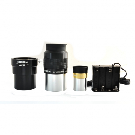 ♦ 2″ okulárový výtah typu Crayford, dvourychlostní 1:10 pro přesné zaměřování. ♦ Velmi kvalitní příslušenství, např. 2″ 30 mm širokoúhlý okulár typu Erfle, 8x50 achromatický hledáček, 9 mm kvalitní Plössl, atd. ♦ Nový systém pro vyrovnávání tření a nadmořské výšky a systém azimutových válečkových ložisek pro velmi jemné a přesné pohybování dalekohledem.