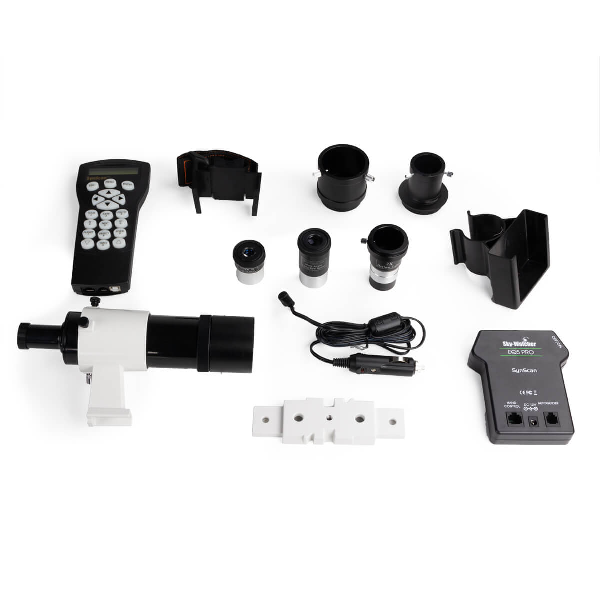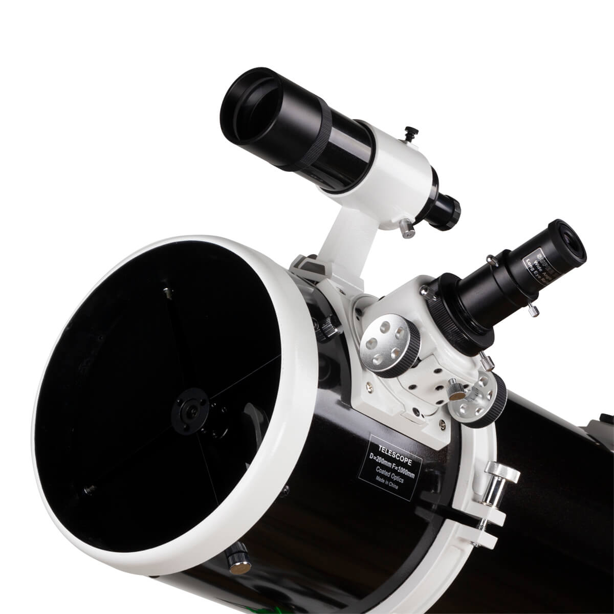 Zrkadlový ďalekohľad typu Newton 203/1000mm, 8”, svetelnosť f/5. Parabolické zrkadlo, výstup 2”, s redukciou na 1.25”. Dva okuláre Plössl 25 a 10mm (40x a 100x) so zorným poľom 50 °. Klasický hľadáčik 9x50. Ťažká nemecká rovníková computerizovaná montáž GEQ-5 PRO SkyScan GoTo s ovládačom na výškovo nastaviteľnom statíve s 1.75” stojnami a odkladacou plochou na príslušenstvo. Napájanie 12V (pokojový odber min. 1.5A). Vo výbave montáže je zabudovaný polárny hľadáčik a 2 protizávažia 5.5kg.