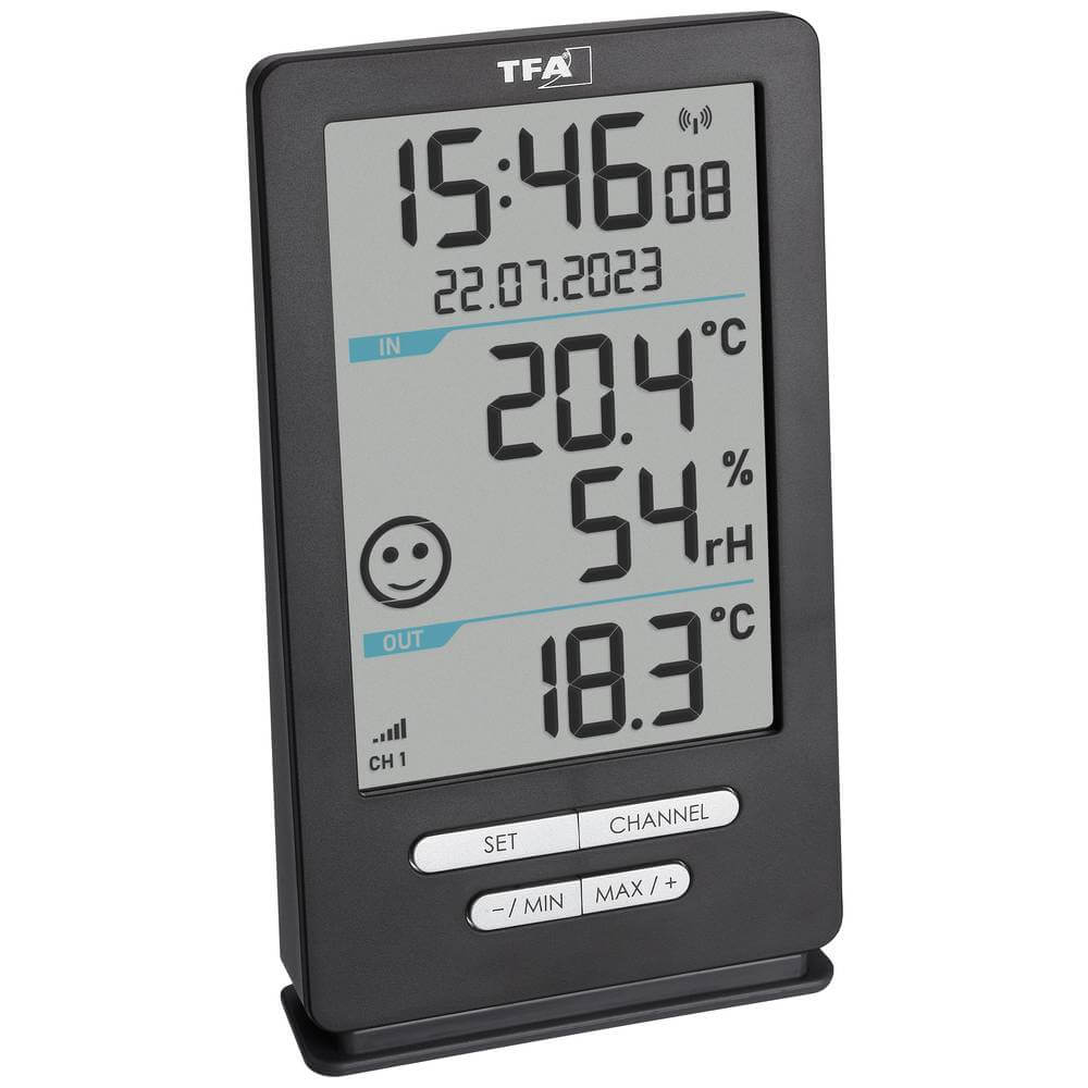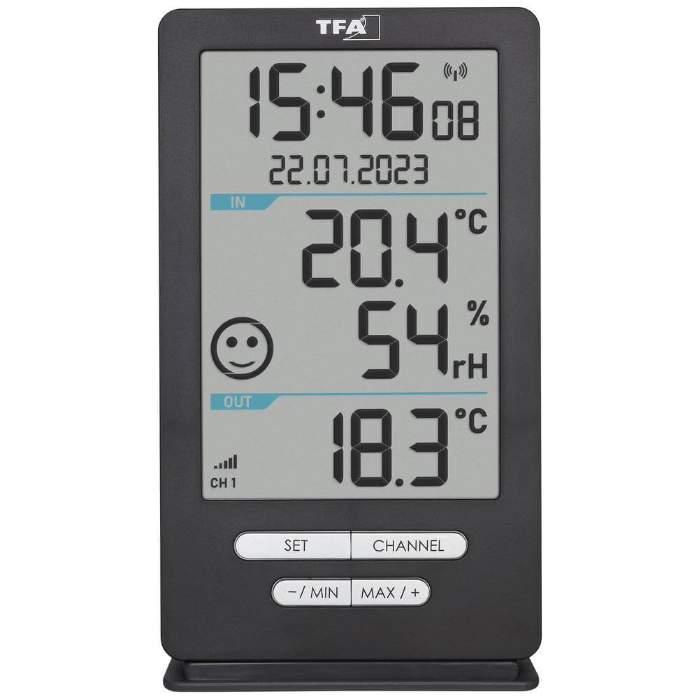 Přístroj kontinuálně monitoruje teplotu a vlhkost v interiéru s rozsahem měření 0 až +50°C pro teplotu a 10 až 99% rH pro relativní vlhkost. Vnější teplota je sledována v širokém rozsahu od -40°C do +60°C, což umožňuje použití i v extrémních klimatických podmínkách. Jedinečnou funkcí je indikátor komfortu ve formě smajlíku, který okamžitě informuje o vhodnosti nebo nevhodnosti aktuálního klimatu v místnosti.